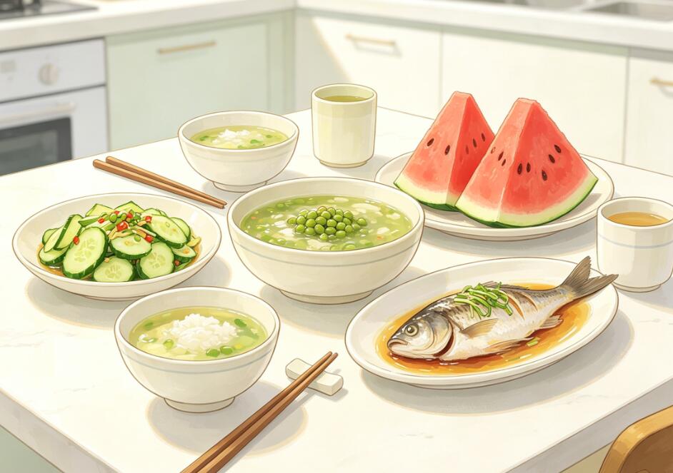 夏天人体消耗较大,要注意补充蛋白质、维生素、水分和无机盐等营养素。宜进食鱼、瘦肉、蛋、奶和豆类,以及新鲜蔬菜、水果,并适食五谷杂粮。饮水的原则是少量、多次,莫待口渴时才饮。可适饮绿豆汤、赤豆汤、银花茶、菊花茶、酸梅汁、西瓜汁、荷叶粥、薏苡仁粥、扁豆粥等。为保护脾胃,夏天要少食或不食辛辣、煎炸助火和油腻难以消化的食物,也不要暴食冷饮。为防止多种肠道传染病,要格外注意饮食卫生,做到饭前、便后及吃东西前洗手,不喝生水,不吃腐烂变质及被污染过的食物,宜多吃生大蒜、醋、茶等具有杀菌、抑菌作用的食物。